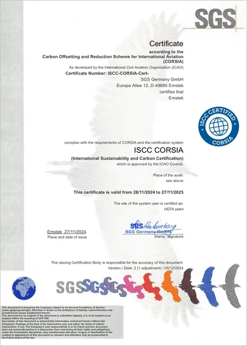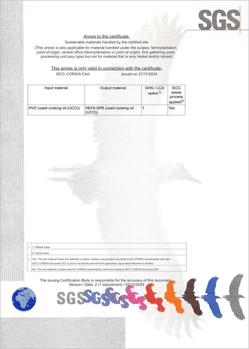 生质航空油(Sustainable Aviation Fuel, SAF)是以可再生原料制成的低碳航空燃料。与传统 Jet A-1 相比,可减少高达 80% 的生命周期碳排放,并可直接混配使用( ASTM D7566 )。